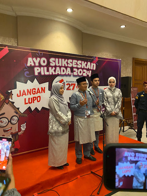 Pasangan Calon Walikota dan Wakil Walikota Jambi Dr dr Maulana, MKM dan Diza Aljosha Hazrin, SE, MA didampingi istri tercinta saat jumpa pers usai debat publik di Ratu Convention Center (RCC) Jambi, Minggu (3/11/2024). (Foto Media Center Maulana-Diza)