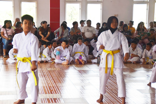 Jambi, J24-Pengurus Provinsi (Pengprov) Karate Shindoka Jambi melakukan ujian kenaikan tingkat atau sabuk kepada 78 orang murid Shindoka Dojo SD Xaverius 2 Kota Jambi, Dojo PDIP dan Dojo Eka Jaya Kota Jambi di Gedung Merah Putih Banteng Moncong Putih Jalan Haji Kamil, Jambi Selatan, Kota Jambi, Minggu (21/1/2024).